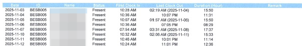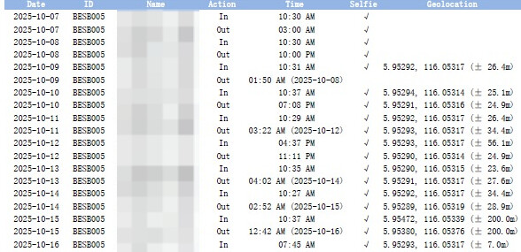 Our Attendance Report looked like this in Oct’25, which including the geolocation coordinates in the report, there’s 2 rows for each day attendance, including selfie indicator and etc.